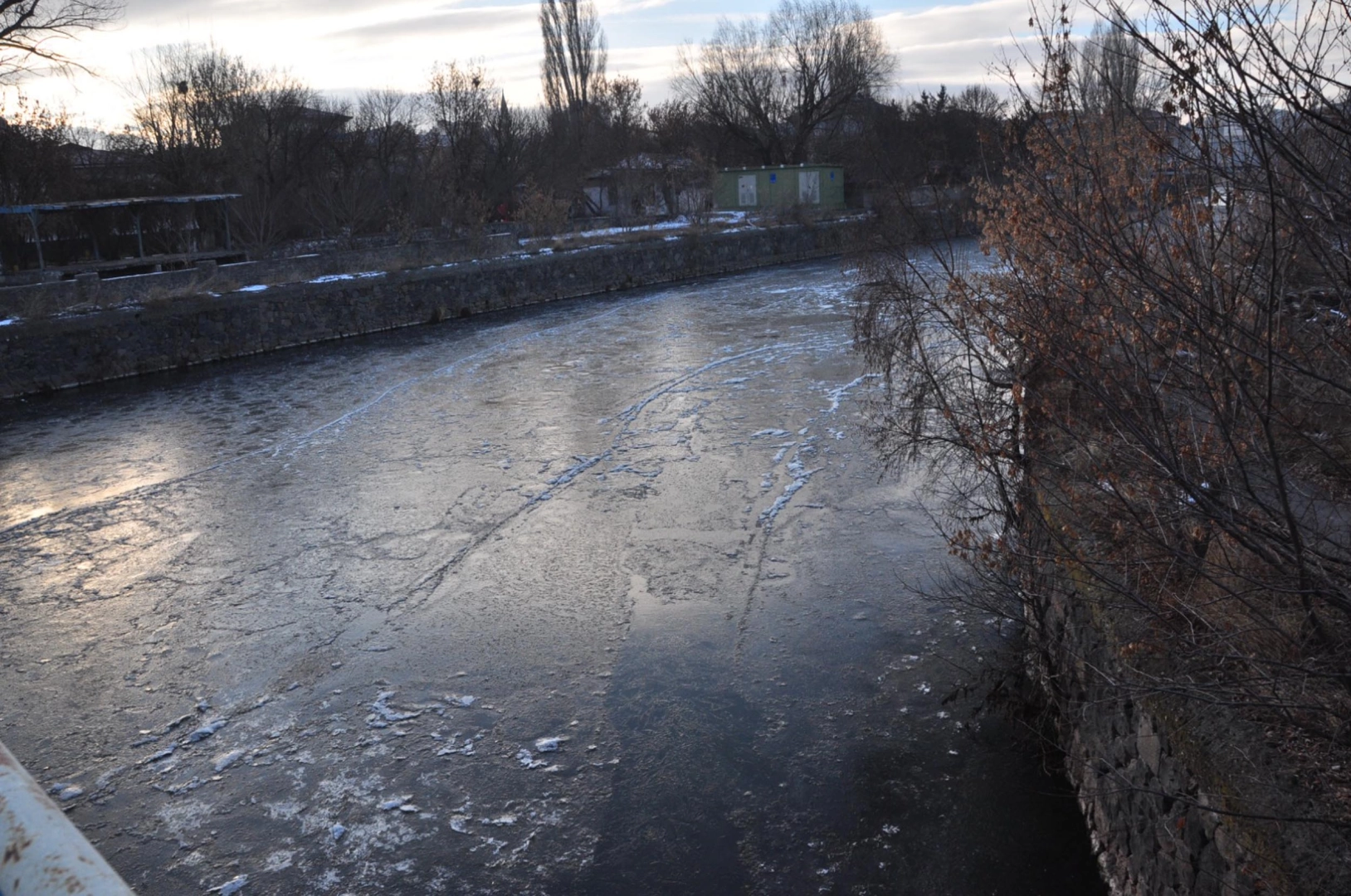 Volkan KARABAĞ/KARS,(DHA)-KARS'ta hava sıcaklığı eksi 15 dereceye kadar düşerken, Kars Çayı kısmen dondu.