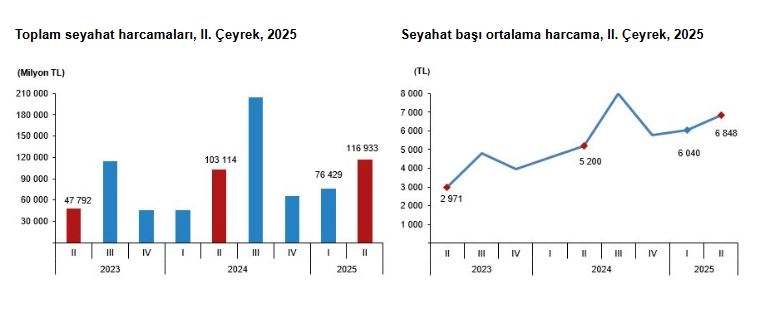 ANKARA, (DHA)- TÜRKİYE İstatistik Kurumu (TÜİK), 2025 yılı Nisan, Mayıs ve Haziran aylarından oluşan 2'nci çeyrekte yerli turistlerin, yurt içinde yaptıkları seyahat harcamalarının bir önceki yılın aynı çeyreğine göre yüzde 13,4 artarak 116 milyar 933 milyon 487 bin TL olarak gerçekleştiğini açıkladı.