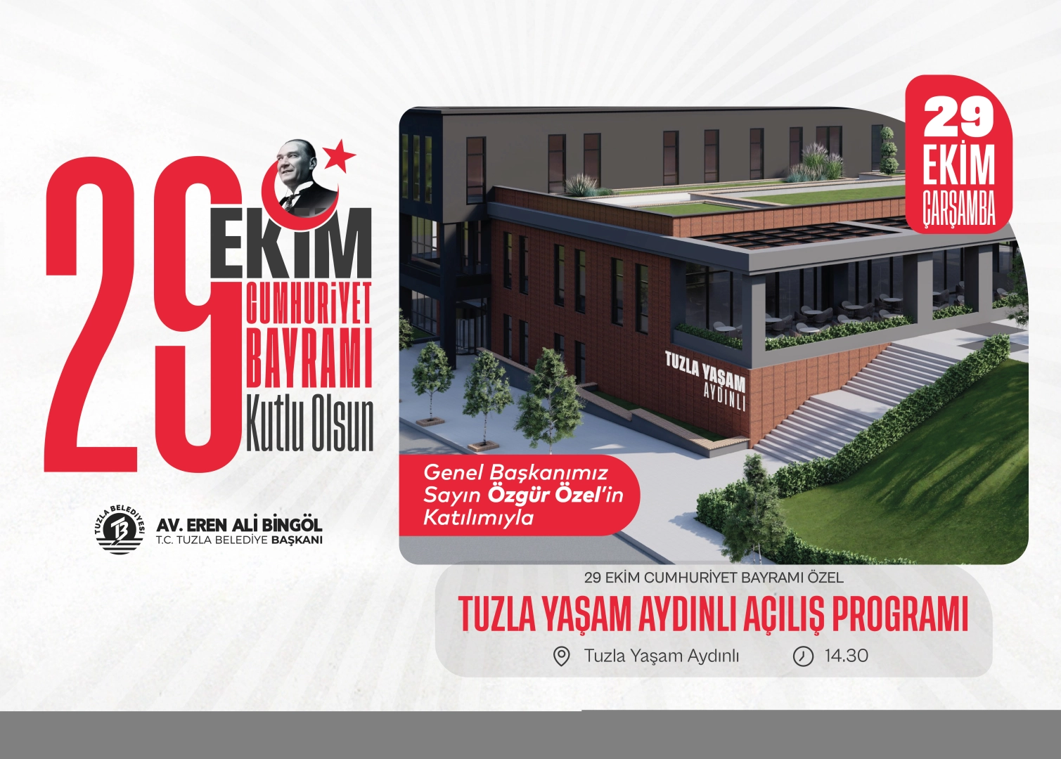 Tuzla Yaşam Aydınlı’nın açılışı, Cumhuriyet Bayramı kutlamaları kapsamında 29 Ekim Çarşamba günü saat 14.30’da gerçekleştirilecek. Törene CHP Genel Başkanı Özgür Özel’in yanı sıra çok sayıda davetli ve vatandaşın katılması bekleniyor.