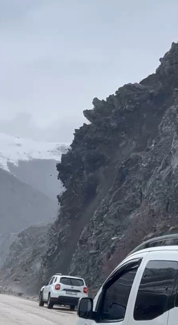 Yüksekova-Yeniköprü kara yolunun 17’nci kilometresinde, çöplük mevkisi yakınlarında saat 16.30 sıralarında heyelan oldu. Sürücüler, dağdan kopan kaya parçalarının yola doğru indiğini fark ederek araçlarını durdurdu. Bu sırada dev bir kaya kütlesi de yola düşerek parçalandı. O anlar, çevredekiler tarafından cep telefonuyla kayda alındı.