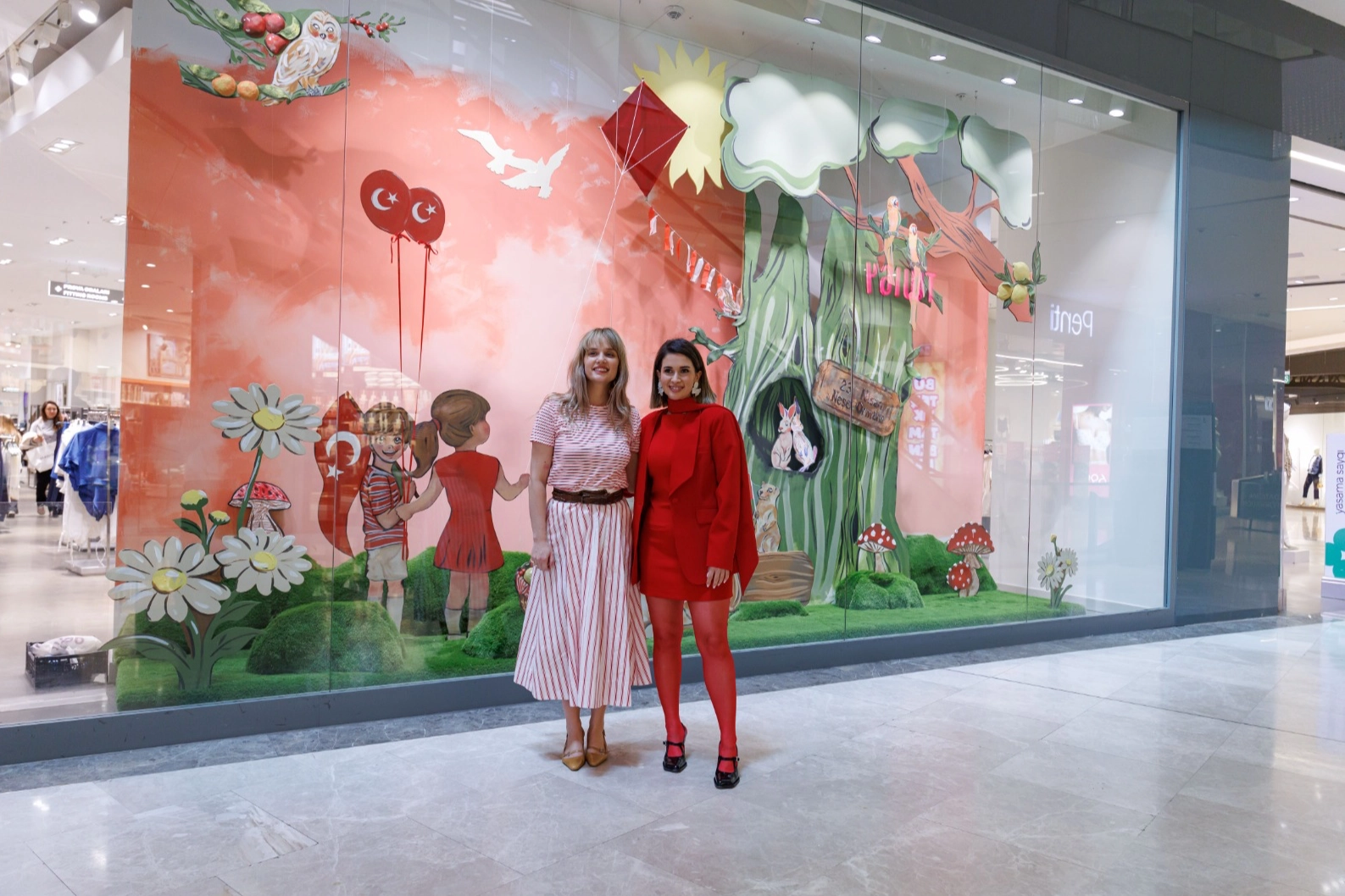 Sanatçı Eda Zamanpur’un “Neşe Ormanı” temasıyla tasarladığı vitrin, çocukların dokunuşlarıyla renklenerek 23 Nisan ruhunu mağazaya taşıdı.