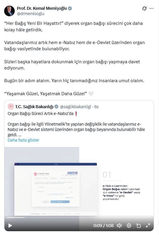 Sağlık Bakanı Kemal Memişoğlu, sosyal medya hesabından yaptığı paylaşımda, "’Her Bağış Yeni Bir Hayattır' diyerek organ bağışı sürecini çok daha kolay hale getirdik. Vatandaşlarımız artık hem e-Nabız hem de e-Devlet üzerinden organ bağışı vasiyetinde bulunabiliyor. Sizleri başka hayatlara dokunmak için organ bağışı yapmaya davet ediyorum. Bugün bir adım atalım. Yarın hiç tanımadığınız insanlara umut olalım. 'Yaşamak Güzel, Yaşatmak Daha Güzel'" ifadelerini kullandı. (DHA)