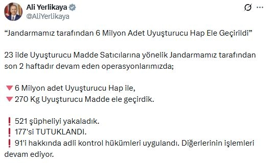 İçişleri Bakanı Yerlikaya, jandarma tarafından son 2 haftada düzenlenen operasyonları, sanal medya hesabından duyurdu. Buna göre; 46 narkotik ve asayiş ekibi, 414 personelin katılımıyla; 23 ilde gerçekleşen operasyonlarda 6 milyon adet uyuşturucu hap ile 270 kilo uyuşturucu ele geçirildi. Operasyonlarda 521 şüpheli yakalandı. Şüphelilerden 177'si tutuklandı. 91'i hakkında adli kontrol hükümleri uygulandı. Diğerlerinin işlemleri devam ediyor.