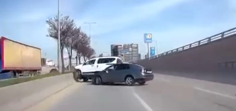 Ankara‘da trafikte makas atarak ilerleyen sürücüsünün kontrolünü yitirdiği 06 DCN 283 plakalı otomobil, 06 BGE 795 plakalı hafif ticari araca arkadan çarptı. Çarpmanın etkisiyle savrulan hafif ticari araç, devrildi. O anlar ise trafikteki başka bir otomobilin araç kamerası tarafından kaydedildi. (DHA)