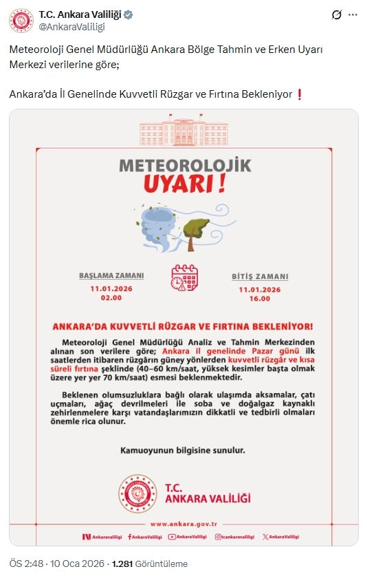 Valiliğin sanal medya hesabından yapılan açıklamada, "Meteoroloji Genel Müdürlüğü Analiz ve Tahmin Merkezinden alınan son verilere göre; Ankara il genelinde pazar günü ilk saatlerden itibaren rüzgarın güney yönlerden kuvvetli rüzgar ve kısa süreli fırtına şeklinde (40-60 kilometre/saat, yüksek kesimler başta olmak üzere yer yer 70 kilometre/saat) esmesi beklenmektedir. Beklenen olumsuzluklara bağlı olarak ulaşımda aksamalar, çatı uçmaları, ağaç devrilmeleri ile soba ve doğal gaz kaynaklı zehirlenmelere karşı vatandaşlarımızın dikkatli ve tedbirli olmaları önemle rica olunur" denildi. (DHA)