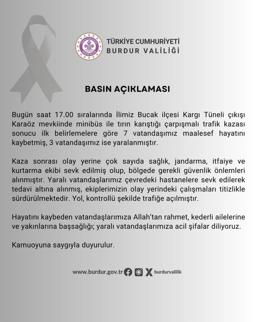 Burdur Valiliği’nden kazaya ilişkin sosyal medya üzerinden yapılan açıklamada, “Bugün saat 17.00 sıralarında ilimiz Bucak ilçesi Kargı Tüneli çıkışı Karaöz mevkisinde minibüs ile beton mikserinin karıştığı çarpışmalı trafik kazası sonucu ilk belirlemelere göre 7 vatandaşımız maalesef hayatını kaybetmiş, 3 vatandaşımız ise yaralanmıştır. Kaza sonrası olay yerine çok sayıda sağlık, jandarma, itfaiye ve kurtarma ekibi sevk edilmiş olup, bölgede gerekli güvenlik önlemleri alınmıştır. Yaralı vatandaşlarımız çevredeki hastanelere sevk edilerek tedavi altına alınmış, ekiplerimizin olay yerindeki çalışmaları titizlikle sürdürülmektedir. Yol, kontrollü şekilde trafiğe açılmıştır. Hayatını kaybeden vatandaşlarımıza Allah’tan rahmet, kederli ailelerine ve yakınlarına başsağlığı, yaralı vatandaşlarımıza acil şifalar diliyoruz” denildi.