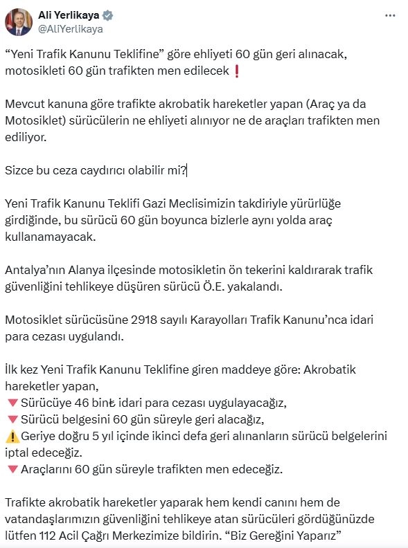 Bakan Ali Yerlikaya, Antalya'nın Alanya ilçesinde motosikletin ön tekerleğini kaldıran sürücünün görüntülerini sosyal medya hesabından paylaşarak, "Mevcut kanuna göre trafikte akrobatik hareketler yapan (Araç ya da Motosiklet) sürücülerin ne ehliyeti alınıyor ne de araçları trafikten menediliyor. Sizce bu ceza caydırıcı olabilir mi? Yeni Trafik Kanunu Teklifi Gazi Meclisimizin takdiriyle yürürlüğe girdiğinde, bu sürücü 60 gün boyunca bizlerle aynı yolda araç kullanamayacak" dedi.