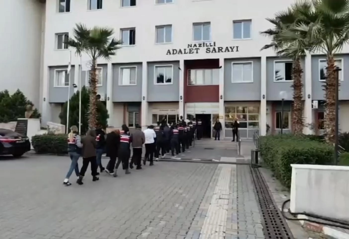 Geniş güvenlik kapsamında Nazilli Adliyesine sevk edilen 19 şüpheli mahkemeye çıkarıldı. Şüpheliler hakkında ‘suç işlemek amacıyla örgüt kurma’, ‘nitelikli dolandırıcılık’, ‘kişisel verilerin hukuka aykırı ele geçirilmesi’ ve ‘tehdit’ suçlarından işlem yapıldı. Şüphelilerden 14’ü tutuklanarak Nazilli E Tipi Kapalı Ceza İnfaz Kurumuna gönderilirken, 5 kişi adli kontrol şartıyla serbest bırakıldı. Yurt dışına kaçan şüpheli için ise yakalama kararı çıkarıldı. (DHA)