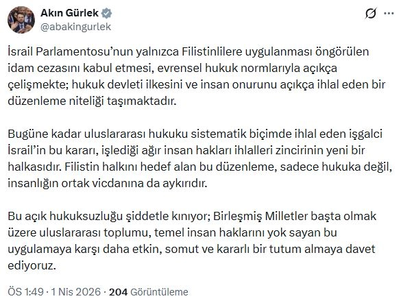 Adalet Bakanı Akın Gürlek, sanal medya hesabından yaptığı açıklamada, "İsrail parlamentosunun yalnızca Filistinlilere uygulanması öngörülen idam cezasını kabul etmesi, evrensel hukuk normlarıyla açıkça çelişmekte; hukuk devleti ilkesini ve insan onurunu açıkça ihlal eden bir düzenleme niteliği taşımaktadır. Bugüne kadar uluslararası hukuku sistematik biçimde ihlal eden işgalci İsrail’in bu kararı, işlediği ağır insan hakları ihlalleri zincirinin yeni bir halkasıdır. Filistin halkını hedef alan bu düzenleme, sadece hukuka değil, insanlığın ortak vicdanına da aykırıdır. Bu açık hukuksuzluğu şiddetle kınıyor; Birleşmiş Milletler başta olmak üzere uluslararası toplumu, temel insan haklarını yok sayan bu uygulamaya karşı daha etkin, somut ve kararlı bir tutum almaya davet ediyoruz" ifadelerini kullandı. (DHA)