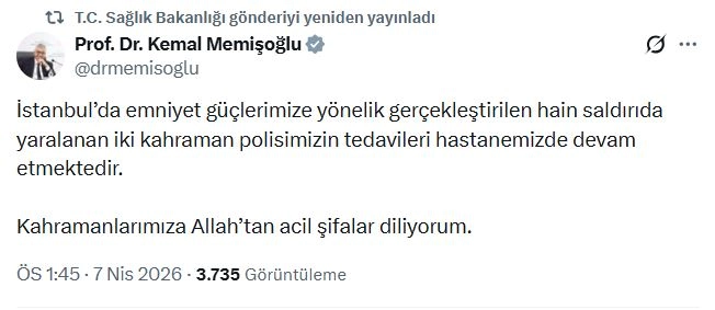 Bakan Memişoğlu, sanal medya hesabından yaptığı açıklamada, "İstanbul’da emniyet güçlerimize yönelik gerçekleştirilen hain saldırıda yaralanan 2 kahraman polisimizin tedavileri hastanemizde devam etmektedir. Kahramanlarımıza Allah’tan acil şifalar diliyorum" dedi. (DHA)