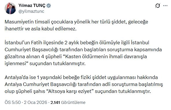 Bakan Tunç, sanal medya hesabından yaptığı açıklamada, "Masumiyetin timsali çocuklara yönelik her türlü şiddet, geleceğe ihanettir ve asla kabul edilemez. İstanbul'un Fatih ilçesinde 2 aylık bebeğin ölümüyle ilgili İstanbul Cumhuriyet Başsavcılığı tarafından başlatılan soruşturma kapsamında gözaltına alınan 4 şüpheli, 'Kasten öldürmenin ihmali davranışla işlenmesi' suçundan tutuklanmıştır. Antalya'da ise 1 yaşındaki bebeğe fiziki şiddet uygulanması hakkında Antalya Cumhuriyet Başsavcılığı tarafından adli soruşturma başlatılmış olup şüpheli şahıs 'Altsoya karşı eziyet' suçundan tutuklanmıştır" ifadelerini kullandı. (DHA)