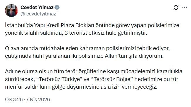 Cumhurbaşkanı Yardımcısı Cevdet Yılmaz, sanal medya hesabından yaptığı açıklamada, "İstanbul’da Yapı Kredi Plaza Blokları önünde görev yapan polislerimize yönelik silahlı saldırıda, 3 terörist etkisiz hale getirilmiştir. Olaya anında müdahale eden kahraman polislerimizi tebrik ediyor, çatışmada hafif yaralanan iki polisimize Allah’tan şifa diliyorum. Adı ne olursa olsun tüm terör örgütlerine karşı mücadelemizi kararlılıkla sürdürecek, 'Terörsüz Türkiye' ve 'terörsüz bölge' hedefimize bu tür menfur saldırıların gölge düşürmesine asla izin vermeyeceğiz" dedi. (DHA)