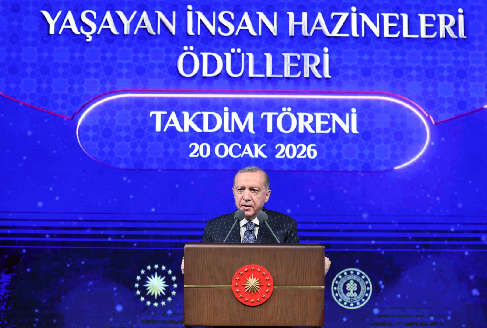 Cumhurbaşkanı Erdoğan, her insanın eşref-i mahlukat sıfatıyla kendi başına bir hazine hükmünde olduğunu kaydederek, "Her birimiz insanı zübde-i alem yani kainatın özü olarak fehmeden, onu bu rüyet ve hüviyetle gören bir anlayışın mensuplarıyız. Medeniyetimizin odak ve hareket noktası insandır, devlet ve hükümet anlayışımızın nirengi noktası insandır. Şehircilik felsefemizin mimarı, estetiğimizin, cihana bakışımızın özü, nüvesi evvel emirde insandır. Sanat ve sanatçı ise fizik sınırlarını aşarak, zahir olanın ötesine maveraya, metafiziğe ve hakikate ulaşma istidadı gösterir, bunun için çabalar. Sanatçıyı bilmediğimiz bir dünyadan bir kaza sonucu dünyamıza düşmüş, fizik ötesi yaşantılı bir kazazede, yeryüzünü ise mutlaklık aleminin dipnotu olarak tarif eden merhum Sezai Karakoç bu hakikati şöyle dile getiriyor; 'Sanat kaçsa da inkar etse de tanrıya doğrudur. Tanrı hakikat ve ebediliktir.' Dostoyevski, ömrü boyunca tanrıyı bulmayı amaçlayan bir roman yazmak ihtirasını taşıdı. Mesnevi bizi hep öteki dünyaya götürme çabasıdır baştan başa. Leyla ile Mecnun da hüsnü aşkta bu sebeple vahdeti vücut inancı ile son bulur. Sanat eseri fizikten kurtuluş, fizik ötesine bir çıkış noktası ararken ileri atılan bir köprü ucudur. Bizim için sanat işte budur. Hakikate doğru yönelen bir yolculuktur. Gerçek sanatçı ve usta işte bu hakikatin izini süren emeğiyle, yorumuyla, eserleriyle bize yeni ufuklar çizen insandır, yaşayan bir hazinedir. Tam da bu anlayışla 2008'den beri sahip olduğumuz sanat birikimini nesilden nesle aktaran sanatçı ve ustalarımızı, yaşayan insan hazineleri ilan ediyoruz. Bugüne kadar 90 kişiyi ve 2 grubu yaşayan insan hazineleri listemize aldık. Geçtiğimiz sene 25 usta ve sanatçımızı bu listeye dahil ettik. Bu yıl ise listemize 10 yeni isim daha ekliyor, yaşayan insan hazineleri varlığımızı daha da zenginleştiriyoruz" dedi.