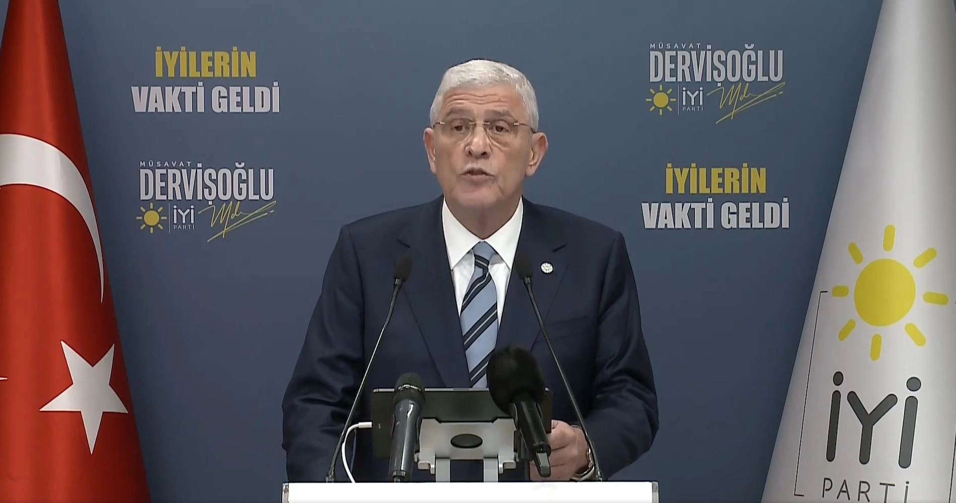 İYİ Parti Genel Başkanı Müsavat Dervişoğlu, parti genel merkezinde basın toplantısı düzenledi. Dervişoğlu, 'Terörsüz Türkiye' hedefi doğrultusunda TBMM'de kurulan komisyonun raporuna ilişkin, "103 yıllık Cumhuriyet'imizi ve milli üniter yapımızı bir terör örgütü elebaşı ve sözcülerinin dili ve aklıyla hedef alan ihanet süreci, komisyonun ortak raporunun yayınlanmasıyla bugün itibarıyla yeni bir aşamaya geçmiştir. Mevcut yasaları bile uygulamayan, tam çeyrek asırdır milletimize adaleti ve demokrasiyi çok gören iktidarın, bir teröristin özgürlüğü için kurduğu komisyondan da çıksa çıksa böyle bir rapor çıkardı" diye konuştu.