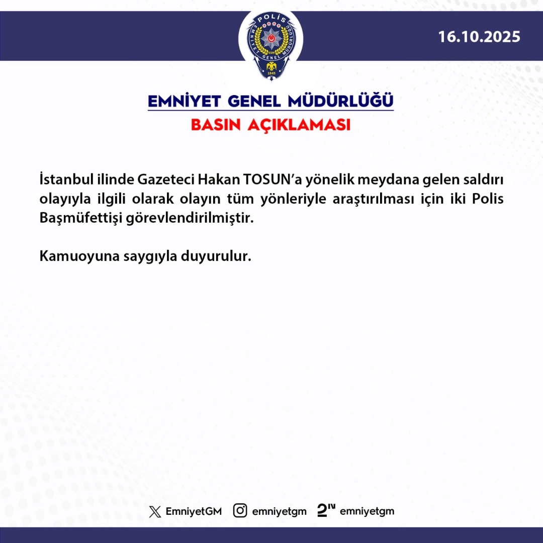 Umutcan ÖREN/ANKARA, (DHA)- EMNİYET Genel Müdürlüğü (EGM), İstanbul'da gazeteci Hakan Tosun'a yönelik saldırı olayı ile ilgili 2 polis başmüfettişi görevlendirildiğini duyurdu.EGM'den yapılan yazılı açıklamada, "İstanbul ilinde gazeteci Hakan Tosun'a yönelik meydana gelen saldırı olayıyla ilgili olarak olayın tüm yönleriyle araştırılması için 2 Polis Başmüfettişi görevlendirilmiştir" denildi. (DHA)
