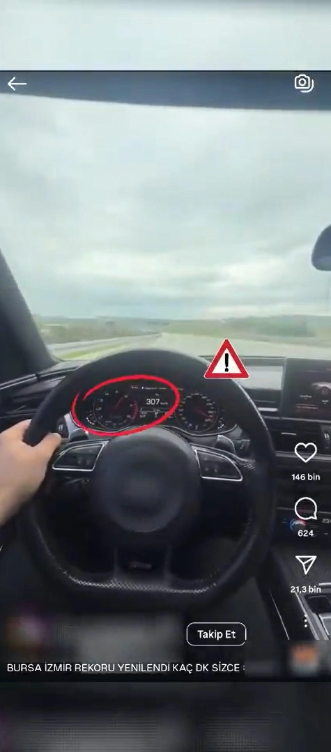 Olay, Gebze-Orhangazi-İzmir O-5 Otoyolu’nda meydana geldi. Kullandığı araçla sınırı aşarak saatte 307 kilometre hızla ilerleyen otomobilin sürücüsü, o anları cep telefonuyla kaydedip sosyal medya hesabında paylaştı. Paylaşıma, "Bursa-İzmir rekoru yenilendi kaç dakika sizce" notunu da ekleyen sürücünün görüntüleri sonrası Otoyol Jandarma Komutanlığı ekipleri, harekete geçti. Ekiplerin incelemesi sonucu sürücünün kimliği tespit edildi. Ekipler, sürücü hakkında 2918 sayılı Karayolları Trafik Kanunu'nun 51/2-C maddesi kapsamında 9 bin 268 TL para cezası uyguladı. Bursa İl Jandarma Komutanlığı’ndan yapılan açıklamada, kamu düzenini ve trafik güvenliğini tehlikeye atan her türlü eylemle mücadelenin kararlılıkla sürdürüleceği vurgulandı. (DHA)
