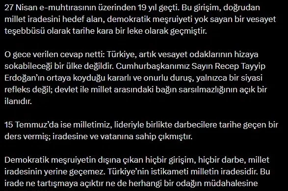 İletişim Başkanı Burhanettin Duran, sanal medya hesabından yaptığı açıklamada, "27 Nisan e-muhtırasının üzerinden 19 yıl geçti. Bu girişim, doğrudan millet iradesini hedef alan, demokratik meşruiyeti yok sayan bir vesayet teşebbüsü olarak tarihe kara bir leke olarak geçmiştir. O gece verilen cevap netti. Türkiye, artık vesayet odaklarının hizaya sokabileceği bir ülke değildir. Cumhurbaşkanımız Sayın Recep Tayyip Erdoğan’ın ortaya koyduğu kararlı ve onurlu duruş, yalnızca bir siyasi refleks değil; devlet ile millet arasındaki bağın sarsılmazlığının açık bir ilanıdır. 15 Temmuz’da ise milletimiz, lideriyle birlikte darbecilere tarihe geçen bir ders vermiş; iradesine ve vatanına sahip çıkmıştır. Demokratik meşruiyetin dışına çıkan hiçbir girişim, hiçbir darbe millet iradesinin yerine geçemez. Türkiye’nin istikameti milletin iradesidir. Bu irade ne tartışmaya açıktır ne de herhangi bir odağın müdahalesine bırakılabilir" dedi. (DHA)