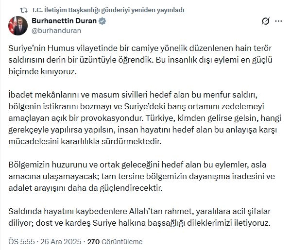 İletişim Başkanı Burhanettin Duran, sanal medya hesabından yaptığı açıklamada, "Suriye'nin Humus vilayetinde bir camiye yönelik düzenlenen hain terör saldırısını derin bir üzüntüyle öğrendik. Bu insanlık dışı eylemi en güçlü biçimde kınıyoruz. İbadet mekanlarını ve masum sivilleri hedef alan bu menfur saldırı, bölgenin istikrarını bozmayı ve Suriye’deki barış ortamını zedelemeyi amaçlayan açık bir provokasyondur. Türkiye, kimden gelirse gelsin, hangi gerekçeyle yapılırsa yapılsın, insan hayatını hedef alan bu anlayışa karşı mücadelesini kararlılıkla sürdürmektedir. Bölgemizin huzurunu ve ortak geleceğini hedef alan bu eylemler, asla amacına ulaşamayacak; tam tersine bölgemizin dayanışma iradesini ve adalet arayışını daha da güçlendirecektir. Saldırıda hayatını kaybedenlere Allah’tan rahmet, yaralılara acil şifalar diliyor; dost ve kardeş Suriye halkına başsağlığı dileklerimizi iletiyoruz" dedi. (DHA)