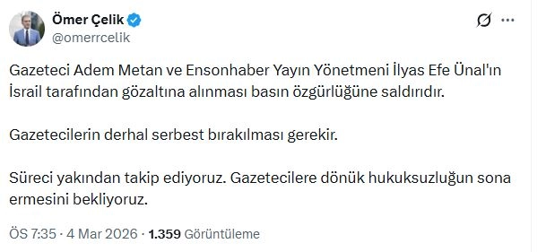 AK Parti Genel Başkan Yardımcısı ve Parti Sözcüsü Ömer Çelik, konuya ilişkin yaptığı paylaşımla tepki gösterdi. Çelik, "Gazeteci Adem Metan ve Ensonhaber Yayın Yönetmeni İlyas Efe Ünal'ın İsrail tarafından gözaltına alınması basın özgürlüğüne saldırıdır. Gazetecilerin derhal serbest bırakılması gerekir. Süreci yakından takip ediyoruz. Gazetecilere dönük hukuksuzluğun sona ermesini bekliyoruz" ifadelerine yer verdi. (DHA)