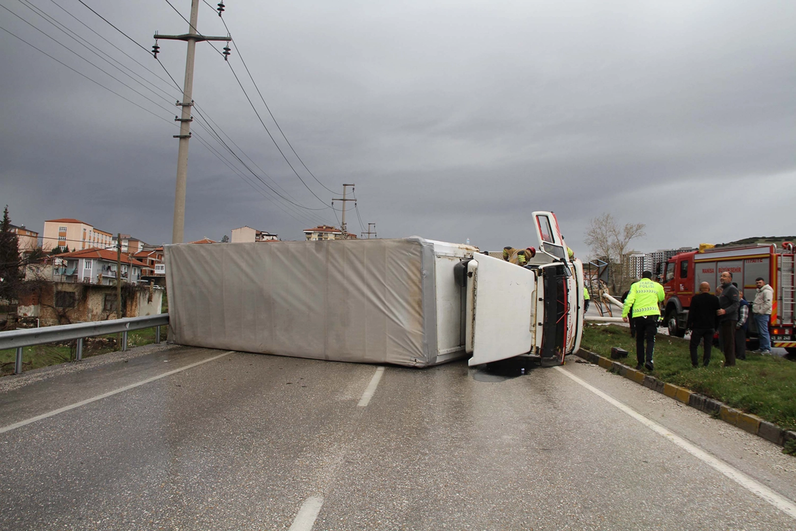 Hasan YİĞEN/KULA (Manisa), (DHA)- MANİSA'nın Kula ilçesinde, yağmur nedeniyle kayganlaşan yolda devrilen kamyonun şoförü Ümit İdem yaralandı. Kaza, bir binanın güvenlik kamerasına yansıdı.