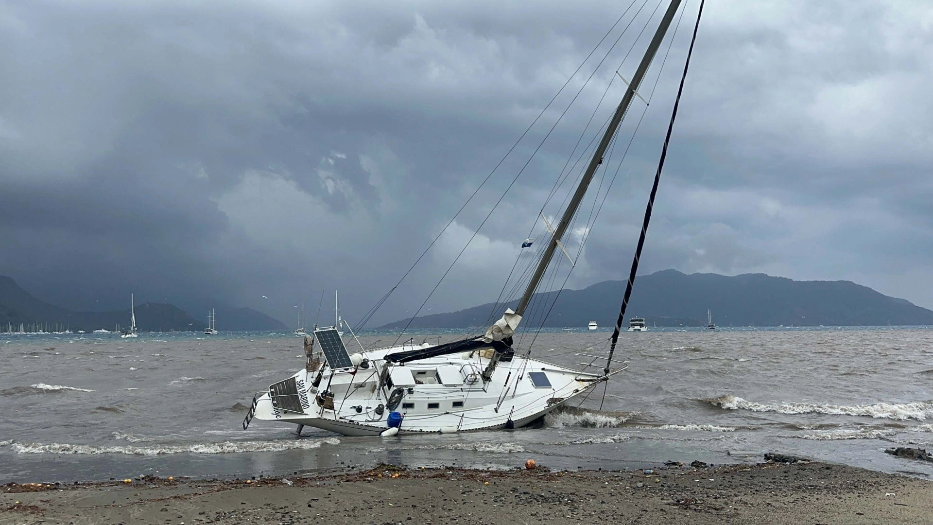 Yaren ÖZDEMİR/MARMARİS (Muğla), (DHA)-MUĞLA'nın Marmaris ilçesinde sağanak ve kuvvetli rüzgar etkili oldu. Kuvvetli rüzgarla birlikte bağlı bulunduğu tonozdan kopan 'San Marino' ve 'Mila 5' isimli yelkenli tekneler, karaya vurdu.