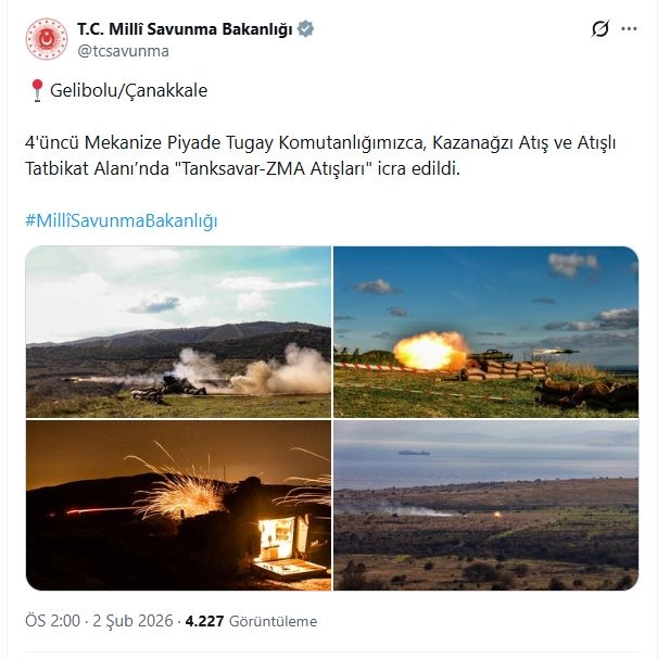 Bakanlığın sanal medya hesabından yapılan açıklamada, "4'üncü Mekanize Piyade Tugay Komutanlığımızca, Kazanağzı Atış ve Atışlı Tatbikat Alanı’nda 'Tanksavar-ZMA atışları' icra edildi" denildi.