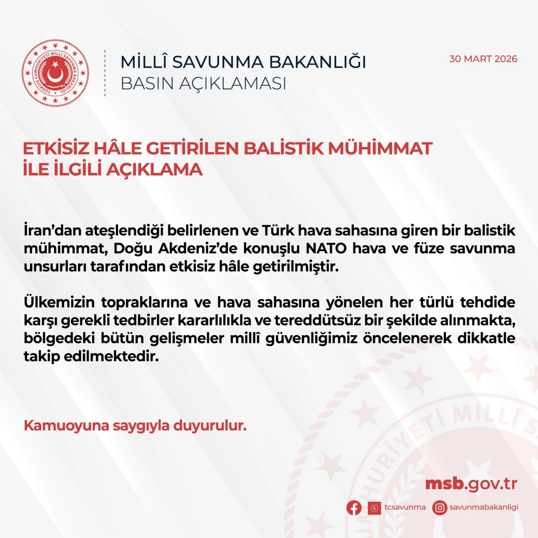 Bakanlıktan yapılan açıklamada, "İran’dan ateşlendiği belirlenen ve Türk hava sahasına giren bir balistik mühimmat, Doğu Akdeniz’de konuşlu NATO hava ve füze savunma unsurları tarafından etkisiz hale getirilmiştir. Ülkemizin topraklarına ve hava sahasına yönelen her türlü tehdide karşı gerekli tedbirler kararlılıkla ve tereddütsüz bir şekilde alınmakta, bölgedeki bütün gelişmeler milli güvenliğimiz öncelenerek, dikkatle takip edilmektedir" denildi. (DHA)