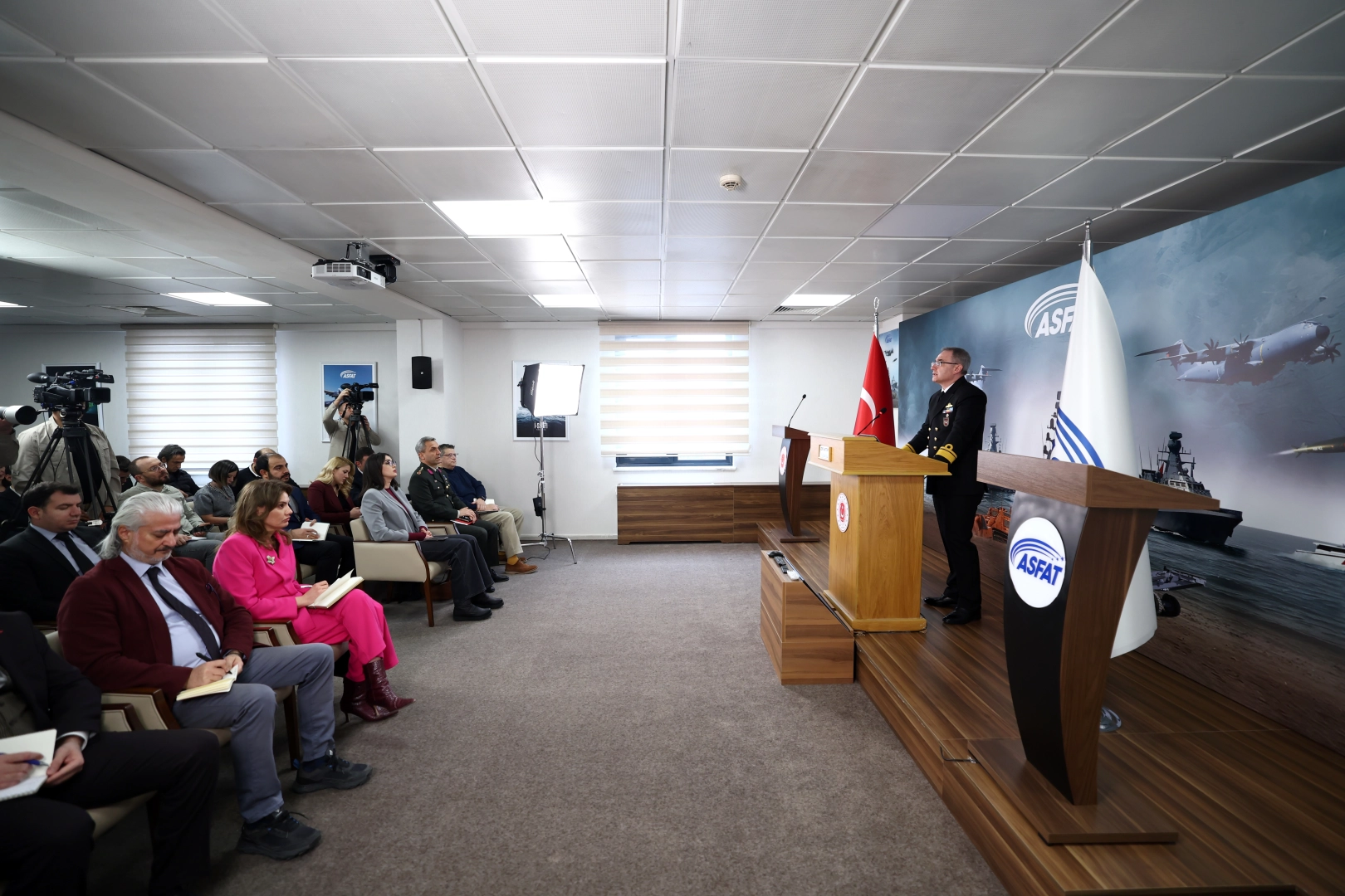 MSB Basın ve Halkla İlişkiler Müşaviri ve Bakanlık Sözcüsü Tuğamiral Zeki Aktürk, haftalık faaliyetlerine ilişkin kuruluşunun 8'inci yılını kutlayan Askeri Fabrika ve Tersane İşletme A.Ş. (ASFAT) yerleşkesinde bilgilendirme toplantısı düzenledi. Tuğamiral Aktürk, ASFAT'ın kara, hava ve deniz platformlarında geliştirdiği yüksek teknolojiye sahip ürünleri, bakım-onarım-modernizasyon kabiliyetleri ve uluslararası projeleriyle Türkiye'nin en hızlı büyüyen savunma sanayi şirketlerinden biri konumuna ulaştığını söyledi. Aktürk, "2025 yılı itibarıyla dünyanın en büyük 100 savunma sanayi şirketi arasında 78'inci sıraya yükselerek önemli bir başarıya imza atmıştır. ASFAT, kuruluşundan bu yana; Pakistan MİLGEM Projesi'nden açık deniz karakol gemilerine, Fırtına obüsü ve Panter modernizasyonundan hassas güdüm kiti üretimine, mekanik mayın temizleme teçhizatından (MEMATT) yüzer havuz ve Milli Denizaltı (MİLDEN) gibi stratejik platformlara kadar geniş bir yelpazede tasarlayıp ürettiği ve geliştirdiği sistemlerle ülkemizin istikrar ve güvenliğine önemli katkılar sağlayan, dost ve müttefiklerimize güç katan ve güven aşılayan bir değer haline gelmiştir" dedi.