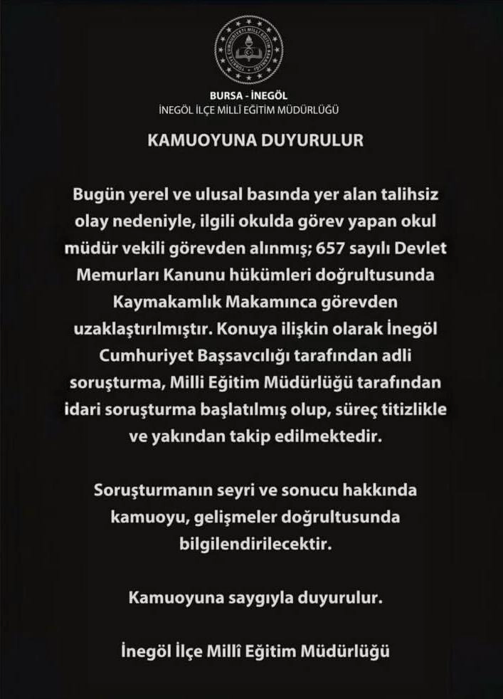 “Bugün yerel ve ulusal basında yer alan talihsiz olay nedeniyle, ilgili okulda görev yapan okul müdür vekili görevden alınmış; 657 sayılı Devlet Memurları Kanunu hükümleri doğrultusunda Kaymakamlık Makamınca görevden uzaklaştırılmıştır. Konuya ilişkin olarak İnegöl Cumhuriyet Başsavcılığı tarafından adli soruşturma, Milli Eğitim Müdürlüğü tarafından idari soruşturma başlatılmış olup, süreç titizlikle ve yakından takip edilmektedir. Soruşturmanın seyri ve sonucu hakkında kamuoyu, gelişmeler doğrultusunda bilgilendirilecektir. Kamuoyuna saygıyla duyurulur." yazıldı.