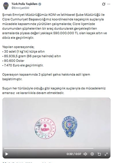 EGM, sanal medya hesabından yapılan paylaşımda, “Şırnak Emniyet Müdürlüğümüz KOM ve İstihbarat Şube Müdürlüğü ile Cizre Cumhuriyet Başsavcılığımız koordinesinde kaçakçılık suçlarıyla mücadele kapsamında yürütülen çalışmalarda; Cizre ilçemizde durumundan şüphelenilen bir araç durdurularak gerçekleştirilen aramalarda piyasa değeri yaklaşık 590.000.000 TL olan kaçak altın ve döviz ele geçirilmiştir. Yapılan operasyonda; 30 adet (1 kg’lık) külçe altın, 85.939,5 gram (66 parça halinde) altın, 90.600 Dolar, 7.470 Euro ele geçirilmiştir. Operasyon kapsamında 3 şüpheli şahıs hakkında adli işlem başlatılmıştır. Suçun her türlüsüyle olduğu gibi kaçakçılık suçlarıyla da mücadelemiz amansız ve kararlılıkla devam etmektedir” ifadeleri kullanıldı. (DHA)