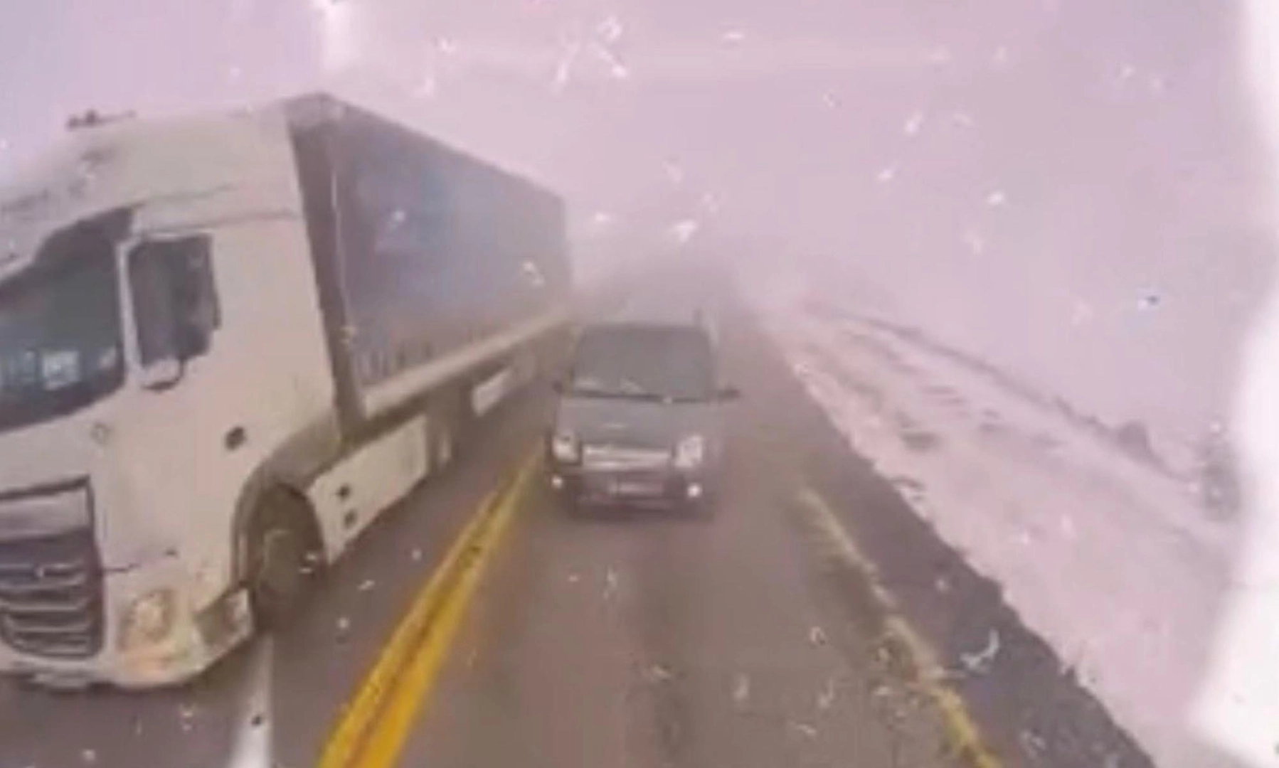 Dinçer AKTEMUR/ ARDAHAN, (DHA)- ARDAHAN- Şavşat kara yolunun Sahara mevkisinde, önünde giden TIR’ı sollayan hafif ticari aracın karşıdan gelen TIR’la çarpıştığı kazada 2 kişi yaralandı. Sisli havada hatalı sollama sonucu meydana gelen kaza araç kamerasına yansıdı.
