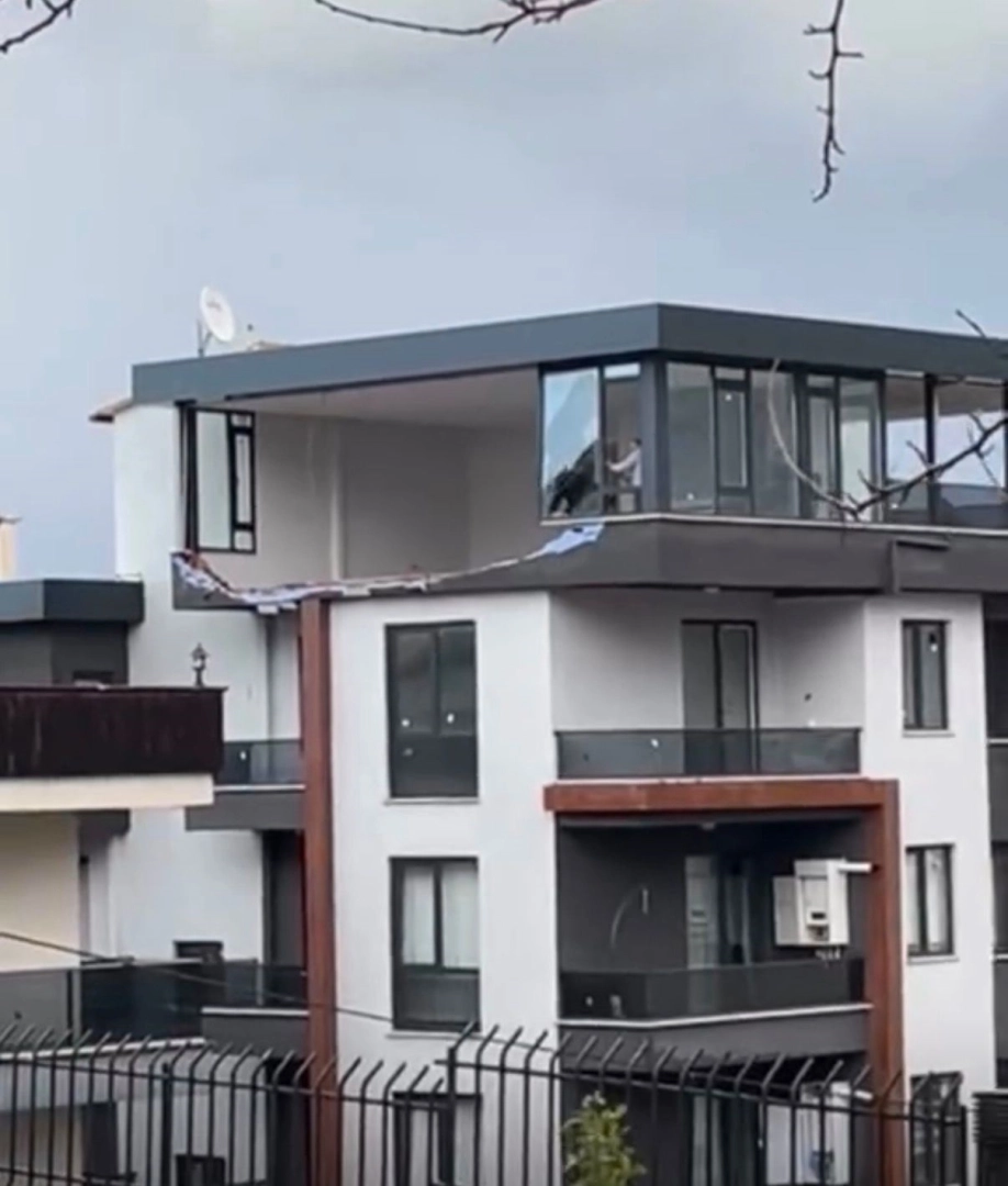 Yalova'da etkili olan fırtına nedeniyle Çiftlikköy ilçesi Bayraktepe Mahallesi'ndeki 4 katlı apartmanın 4'üncü katındaki balkon duvarı yıkıldı. Olayda şans eseri yaralanan olmadı. (DHA)