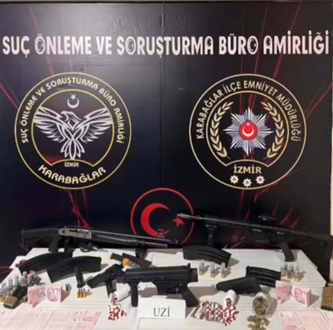 Gündüz saatlerinde tabancayla yaralanmış halde Atatürk Eğitim ve Araştırma Hastanesi'ne gelen M.A.B.'nin, şüpheli ifadeleri polisi harekete geçirdi. Karabağlar İlçe Emniyet Müdürlüğü Suç Önleme ve Soruşturma Büro Amirliği ekipleri, M.A.B.'nin hastane polisine tutarsız bilgiler verdiğini ve ardından tedaviyi reddedip hastaneden ayrıldığını belirledi. Olayın meydana geldiği ev tespit eden polis, adrese gitti. Evde yapılan aramada ruhsatsız Uzi marka makineli tabanca, 1 ruhsatsız tabanca, 2 ruhsatsız pompalı av tüfeği, 6 tüfek şarjörü, 1 tabanca şarjörü, 139 uyuşturucu hap, 30 gram esrar ve 63 bin TL ele geçirildi. Ayrıca M.A.B.'nin evin önündeki otomobilinde yapılan aramada ise 69 adet 9 mm çapında fişek, 1 Rambo bıçağı bulundu. Polis ekipleri, kazayla kendisini vurduğunu ileri süren M.A.B.'nin tedavi amaçlı başka bir hastaneye gittiğini belirledi. Tedavisinin ardından M.A.B. ile evde bulunan babası A.B. ve eniştesi Ö.G. polis ekiplerince gözaltına alındı. 3 şüphelinin polisteki işlemlerinin sürdüğü bildirildi. (DHA)