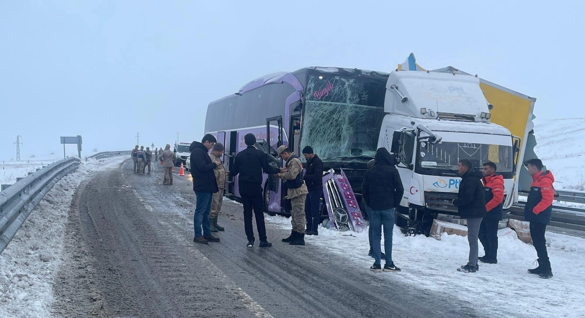 Kaza, Sarıkamış ilçesi Karakurt mevkisinde meydana geldi. Emre Can A.'nın kullandığı 06 EE 0189 plakalı kargo kamyonu, kar yağışı nedeniyle kayganlaşan yolda kontrolden çıktı. Kamyon refüje çarparak durdu. Bu sırada seyreden Mehmet Zülküf Ç.'nın kullandığı 23 AEV 640 plakalı yolcu otobüsü, kamyona çarptı. Bölgeye, AFAD, sağlık ve jandarma ekipleri sevk edildi. Kazada yaralanan 9 kişi, ambulanslarla çevredeki hastanelere kaldırıldı. Kaza nedeniyle kara yolunda ulaşım kontrollü sağlanıyor. (DHA)