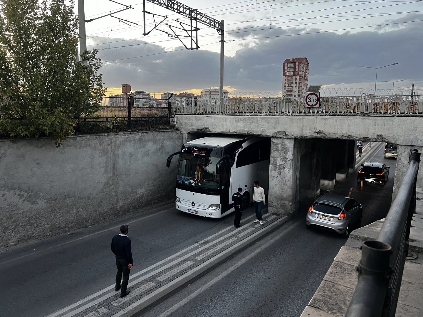 Furkan KAVUKLU/ KAYSERİ, (DHA)- ERCİYES 38 FK ile pazar günü oynayacağı maç için Kayseri’ye gelen Ağrı 1970 Spor’un takım otobüsü, antrenman dönüşünde altgeçide sıkıştı. Kazada yaralanan olmadı. Olay, akşam saatlerinde Kocasinan ilçesi Bağdat Caddesi’ndeki altgeçitte meydana geldi. ERCİYES 38 FK ile pazar günü oynayacağı maç için Kayseri’ye gelen Ağrı 1970 Spor’un oyuncuları, Vali Muammer Güler Sahası'nda antrenman yaptı. Antrenman sonrası oyuncuları otele götüren 04 AS 250 plakalı otobüs, altgeçide sıkıştı. Otobüsteki oyuncular ve kafile başka araçla otele geçerken, altgeçide sıkışan otobüs ise lastiklerin havası indirilerek sıkıştığı yerden kurtarıldı. (DHA)