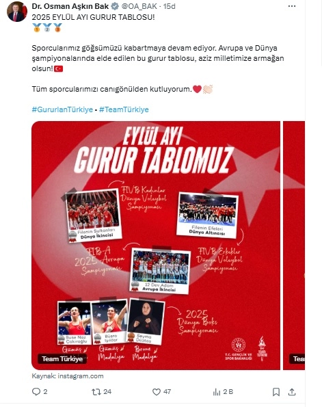 Mikail KARAMAN/ANKARA,(DHA)- GENÇLİK ve Spor Bakanı Osman Aşkın Bak, sosyal medya hesabından yaptığı paylaşımda, olimpik ve paralimpik branşlarda mücadele eden milli sporcuların, eylül ayında aldığı başarılı sonuçlara dikkat çekerek, “Sporcularımız göğsümüzü kabartmaya devam ediyor. Avrupa ve Dünya şampiyonalarında elde edilen bu gurur tablosu, aziz milletimize armağan olsun. Tüm sporcularımızı canıgönülden kutluyorum” ifadesini kullandı.Milli sporcular, eylül ayında uluslararası organizasyonlarda takımlar ve ferdi müsabakalarda önemli başarılar kazandı. Gençlik ve Spor Bakanı Osman Aşkın Bak, sosyal medya hesaplarından, Türk sporunda eylül ayında alınan başarı tablosunu paylaştı. Bakan Bak, ‘Eylül ayı gurur tablomuz’ başlığı altında yaptığı paylaşımda, milli sporcuların kazandığı başarıların bulunduğu görsellere yer verdi. Bakan Bak, olimpik ve paralimpik branşlarda mücadele eden milli sporcuların, eylül ayında başarılı sonuçlar aldığını vurgulayarak, “Sporcularımız göğsümüzü kabartmaya devam ediyor. Avrupa ve Dünya şampiyonalarında elde edilen bu gurur tablosu, aziz milletimize armağan olsun. Tüm sporcularımızı canıgönülden kutluyorum” değerlendirmesinde bulundu.MİLLİ SPORCULAR TARİHİ BAŞARILARA İMZA ATTIBakanlıktan yapılan açıklamada ise, “Takım sporlarında; A Milli Erkek Basketbol Takımı, Letonya’da düzenlenen Avrupa Şampiyonası'nda 2’nci olurken, A Milli Kadın Voleybol Takımı Tayland'da yapılan Dünya Şampiyonası'nda gümüş madalya kazandı. A Milli Erkek Voleybol Takımı ise Filipinler'de düzenlenen Dünya Şampiyonası'nı 6’ncı sırada tamamlayarak organizasyon tarihindeki en iyi derecesini elde etti. Ferdi müsabakalarda; milli sporcularımız Dünya Para Yüzme Şampiyonası'nda 10 madalya, Avrupa Para Judo Şampiyonası’nda 10 madalya, Dünya Para Okçuluk Şampiyonasında 4 madalya, Dünya Para Atletizm Şampiyonası'nda 4 madalya, Dünya Boks Şampiyonasında 3 madalya, Dünya Güreş Şampiyonası'nda 3 madalya, Dünya Para Trap Şampiyonası'nda ise 1 madalya kazandı” denildi. (DHA)