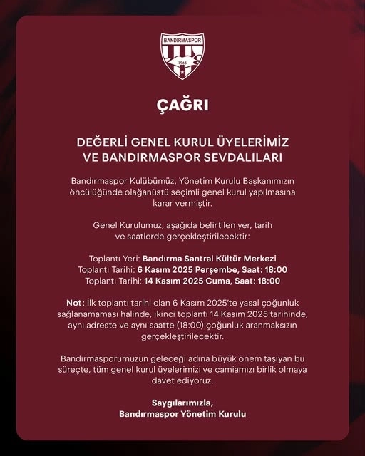 Bandırmaspor Kulübü'nden yapılan paylaşımda, “Bandırmaspor Kulübümüz, Yönetim Kurulu Başkanımızın öncülüğünde olağanüstü seçimli genel kurul yapılmasına karar vermiştir. Genel kurulumuz, 6 Kasım’da Bandırma Santral Kültür Merkezi’nde ilk toplantısını yapacaktır. Yasal çoğunluğun sağlanmaması taktirde ikinci toplantı, 14 Kasım’da aynı yerde çoğunluk aranmaksızın gerçekleştirilecektir. Bandırmasporumuzun geleceği adına büyük önem taşıyan bu süreçte, tüm genel kurul üyelerimizi ve camiamızı birlik olmaya davet ediyoruz” ifadelerine yer verildi.