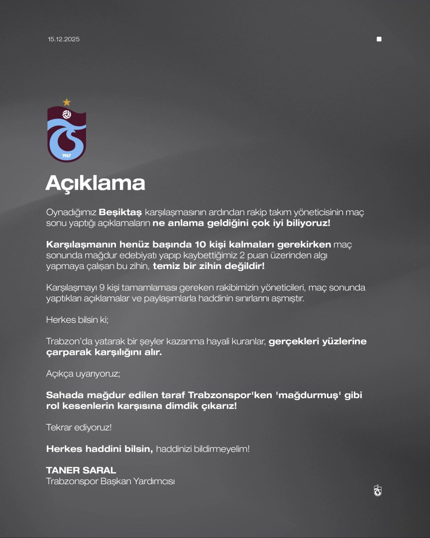 “Herkes bilsin ki; Trabzon’da yatarak bir şeyler kazanma hayali kuranlar, gerçekleri yüzlerine çarparak karşılığını alır. Sahada mağdur edilen taraf Trabzonspor’ken, ‘mağdurmuş’ gibi rol kesenlerin karşısına dimdik çıkarız. Açıkça uyarıyoruz; Sahada mağdur edilen taraf Trabzonspor'ken 'mağdurmuş' gibi rol kesenlerin karşısına dimdik çıkarız! Tekrar ediyoruz! Herkes haddini bilsin, haddinizi bildirmeyelim”