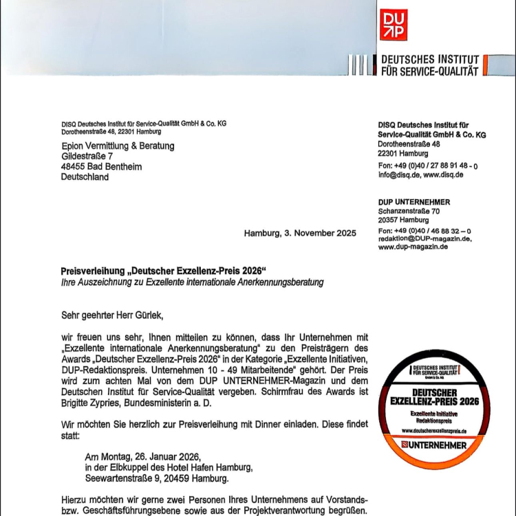 Almanya’da hizmet kalitesi ve müşteri memnuniyeti alanında en itibarlı değerlendirme kuruluşlarından biri olan Deutsches Institut für Service-Qualität (DISQ), 2026 yılı Deutscher Exzellenz-Preis sonuçlarını açıkladı. Türkiye’den Almanya’ya göç etmek isteyen Tıp ve Diş Hekimlerine profesyonel denklik danışmanlığı sunan ve aynı zamanda sektörde tek, Türk-Alman Ticaret ve Sanayi Odasına üye konumda bulunan EPION Vermittlung & Beratung, “Exzellente Internationale Anerkennungsberatung” kategorisinde ülke genelindeki tüm firmaları geride bırakarak Almanya’nın en iyi danışmanlık şirketi seçildi.