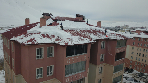 Özcan ÇİRİŞ/BİTLİS, (DHA)-BİTLİS'te bina çatılarında biriken karlar, küreyiciler tarafından belli ücret karşılığında temizleniyor. Bellerine bağladıkları iplerle çatı ucuna kadar uzanan küreyiciler, bir yandan da soğukla mücadele ediyor. Türkiye'nin en fazla kar alan yerleşim yerlerinden olan Bitlis'te yağış sonrası çatılarda biriken karlar tehlike oluşturuyor. Kış aylarında küreyiciler, belli ücret karşılığında çatılara çıkarak bellerine bağladıkları iplerle çatı ucuna kadar uzanıp, biriken karları düşürüyor. Soğuk havanın hüküm sürdüğü kentte küreyiciler, günde 1 ya da 2 binanın çatısını temizliyor. Genelde 3 kişilik ekip olarak çalışan küreyiciler, metrelerce yükseklikten düşmemek için kullandıkları ipin bir ucunu kendilerine, diğer ucunu bacaya bağlıyor. Çatıda 2 kişi kürekle karları temizlerken, diğeri bir noktaya bağlanan ipi tutarak güvenliklerini sağlamaya çalışıyor. (DHA)