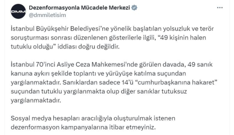 ANKARA, (DHA)- İLETİŞİM Başkanlığı Dezenformasyonla Mücadele Merkezi’nden yapılan açıklamada, “İstanbul Büyükşehir Belediyesi'ne yönelik başlatılan yolsuzluk ve terör soruşturması sonrası düzenlenen gösterilerle ilgili, '49 kişinin halen tutuklu olduğu' iddiası doğru değildir” denildi. Dezenformasyonla Mücadele Merkezi'nin sosyal medya hesabından yapılan açıklamada, "İstanbul Büyükşehir Belediyesi'ne yönelik başlatılan yolsuzluk ve terör soruşturması sonrası düzenlenen gösterilerle ilgili, '49 kişinin halen tutuklu olduğu' iddiası doğru değildir. İstanbul 70'inci Asliye Ceza Mahkemesi'nde görülen davada, 49 sanık kanuna aykırı şekilde toplantı ve yürüyüşe katılma suçundan yargılanmaktadır. Sanıklardan sadece 14'ü 'cumhurbaşkanına hakaret' suçundan tutuklu yargılanmakta olup diğer sanıklar tutuksuz yargılanmaktadır. Sosyal medya hesapları aracılığıyla oluşturulmak istenen dezenformasyon kampanyalarına itibar etmeyiniz" ifadeleri kullandı. (DHA)