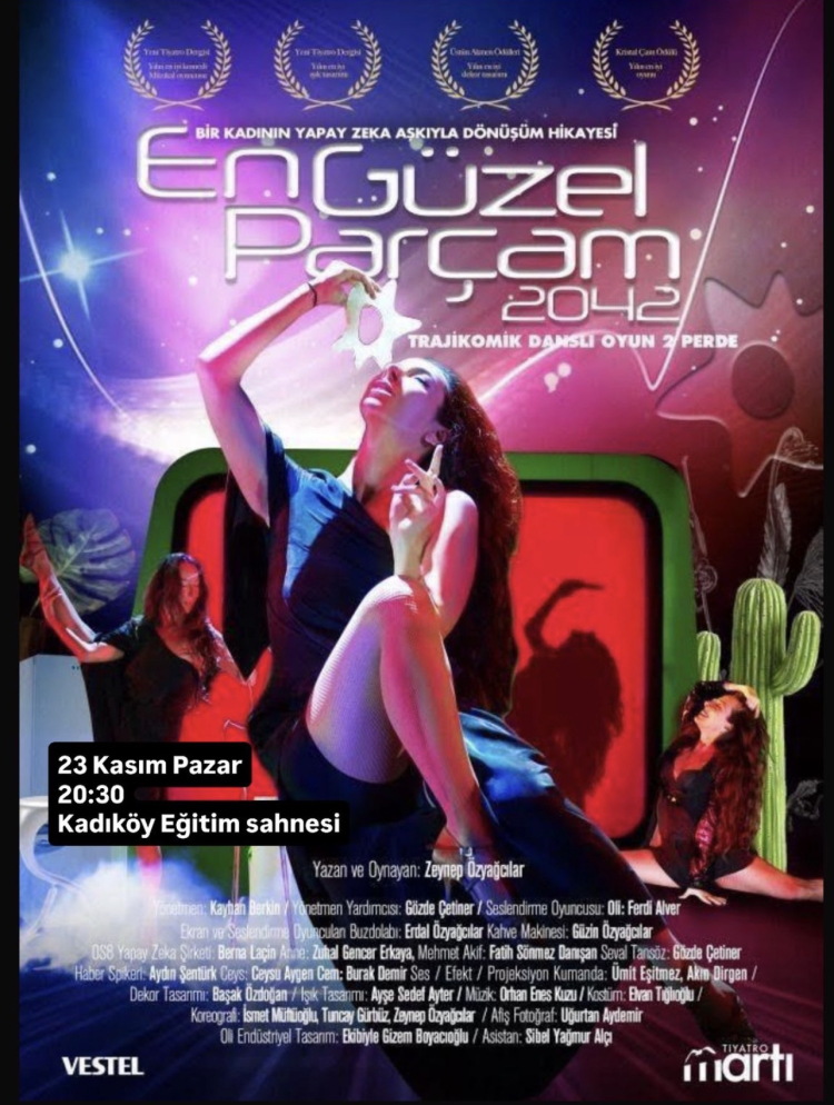 “En Güzel Parçam 2042” adlı tiyatro oyunu, yapay zeka sevgilisi ile dönüşüm yaşayan bir kadının hikayesini anlatıyor. Oyun, gelecekte yapay zekâların hüküm sürdüğü bir dünyayı sahneliyor. Başrolde Zeynep Özyağcılar ve yapay zeka karakter Korel Cezayirli var.