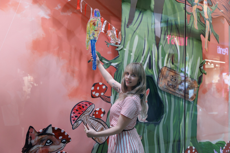 Sanatçı Eda Zamanpur’un “Neşe Ormanı” temasıyla tasarladığı vitrin, çocukların dokunuşlarıyla renklenerek 23 Nisan ruhunu mağazaya taşıdı.